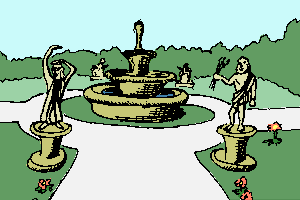 You are in the Castle Gardens. Some ancient statues and a fountain stand before you. To the left are the stables. The path on the right runs around the castle.