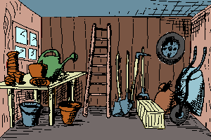 You are in the Garden Shed. A ladder leans against the wall. You think this may be useful. The rest of the room is filled with all kinds of rubbish.